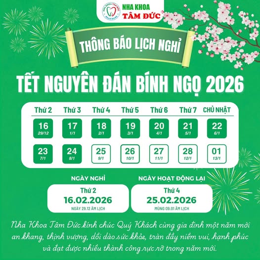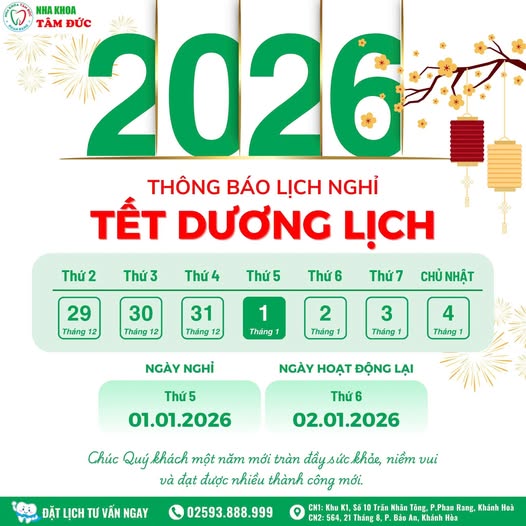 Thông báo nghỉ Tết Dương Lịch 2026 Nhân dịp Tết Dương Lịch 2026, Nha Khoa Tâm Đức xin trân trọng thông báo đến Quý khách hàng lịch nghỉ – hoạt động như sau: Ngày nghỉ: Thứ 5 – 01/01/2026 Ngày hoạt động trở lại: Thứ 6 – 02/01/2026 Nhân dịp năm mới, Nha Khoa […]