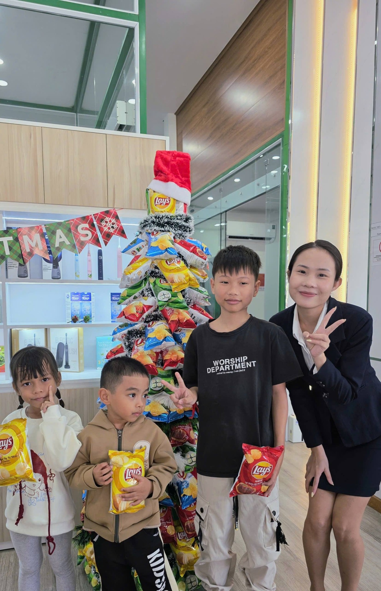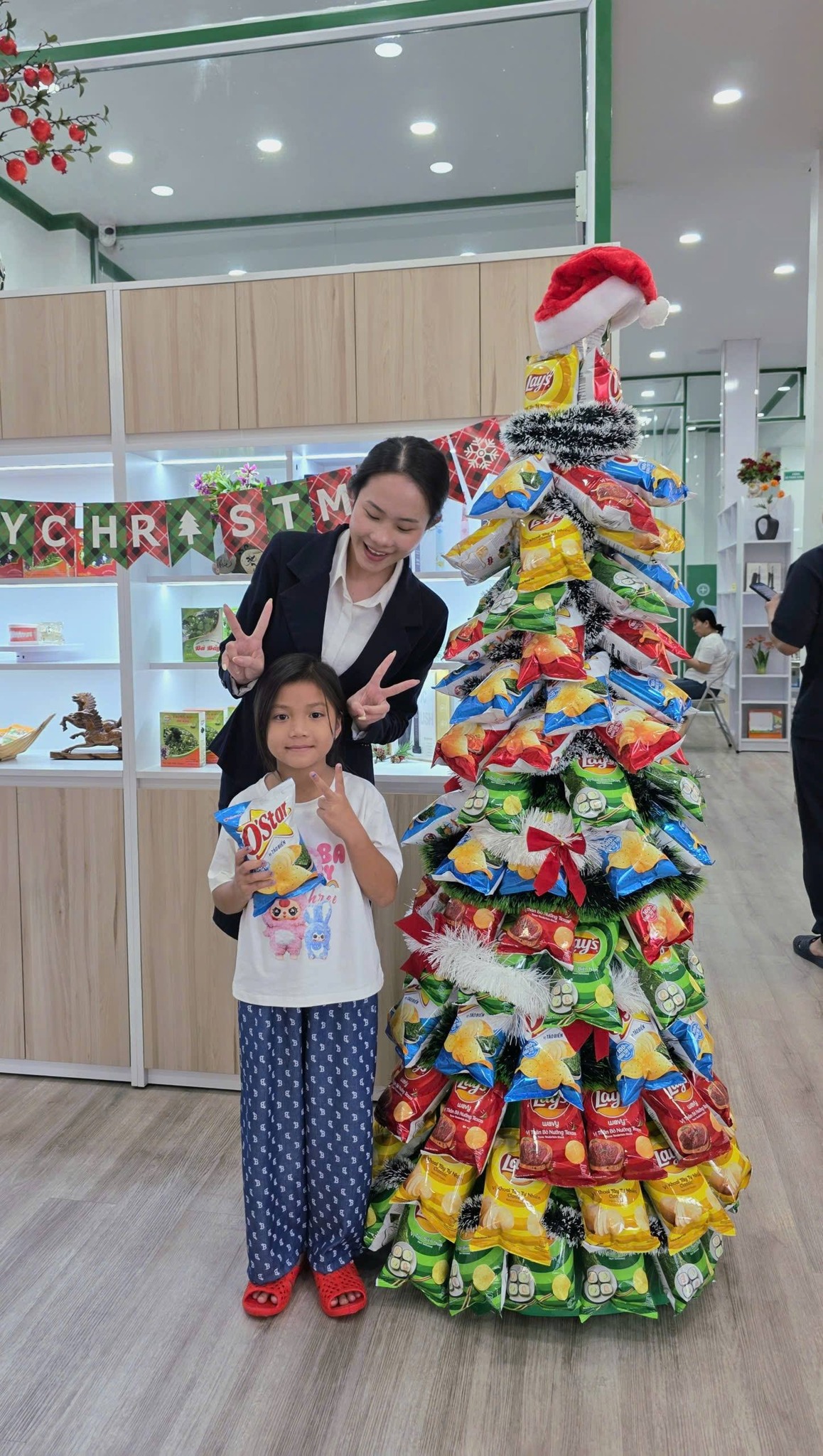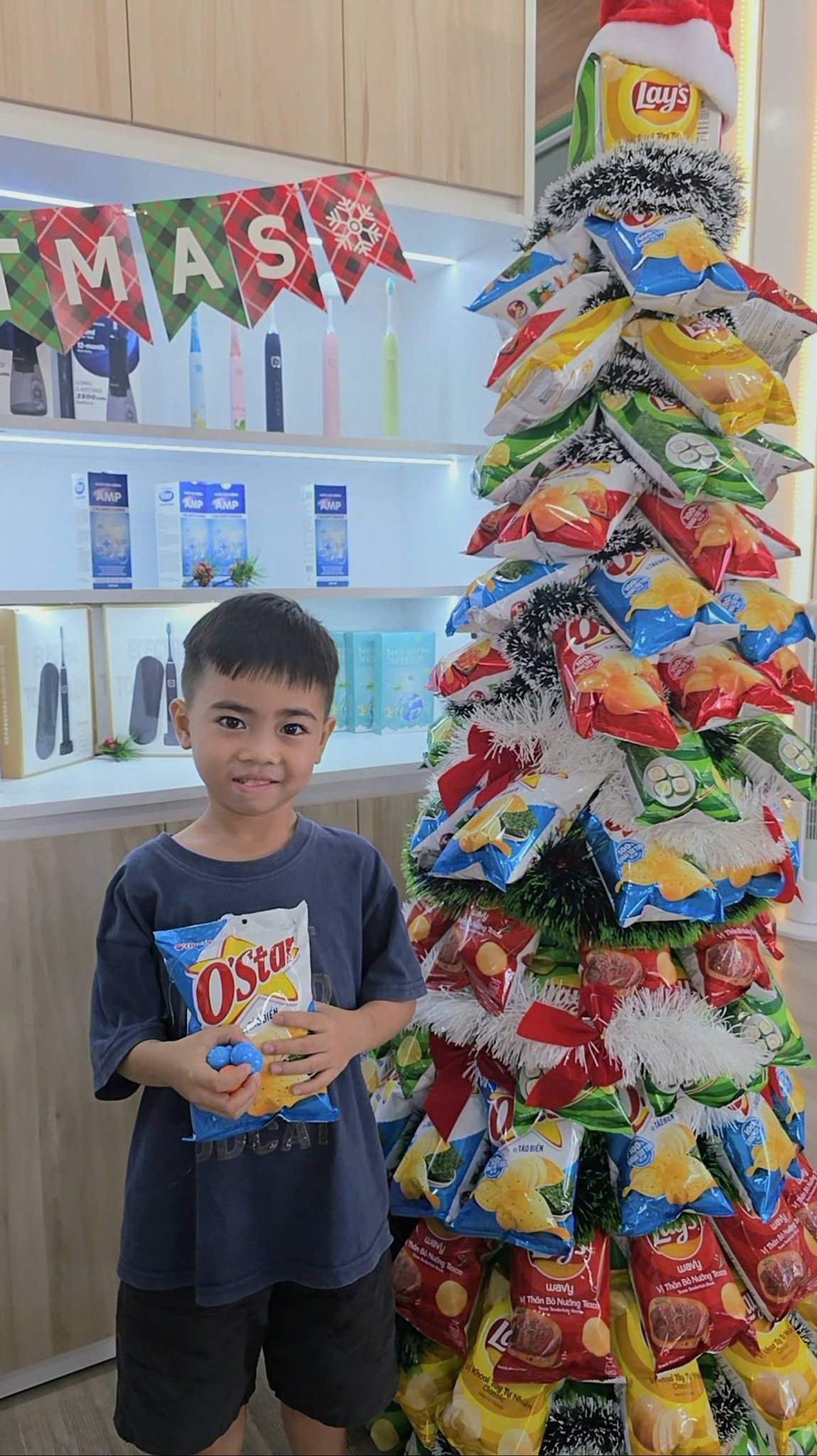 Cây thông được kết từ hàng trăm gói bánh snack đầy màu sắc.